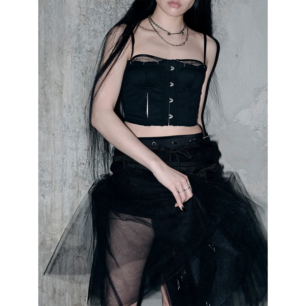 右身頃のスリットやメタルパーツなどのパンク要素を取り入れながら、カップ内側には落ち着いたレースをレイヤード。